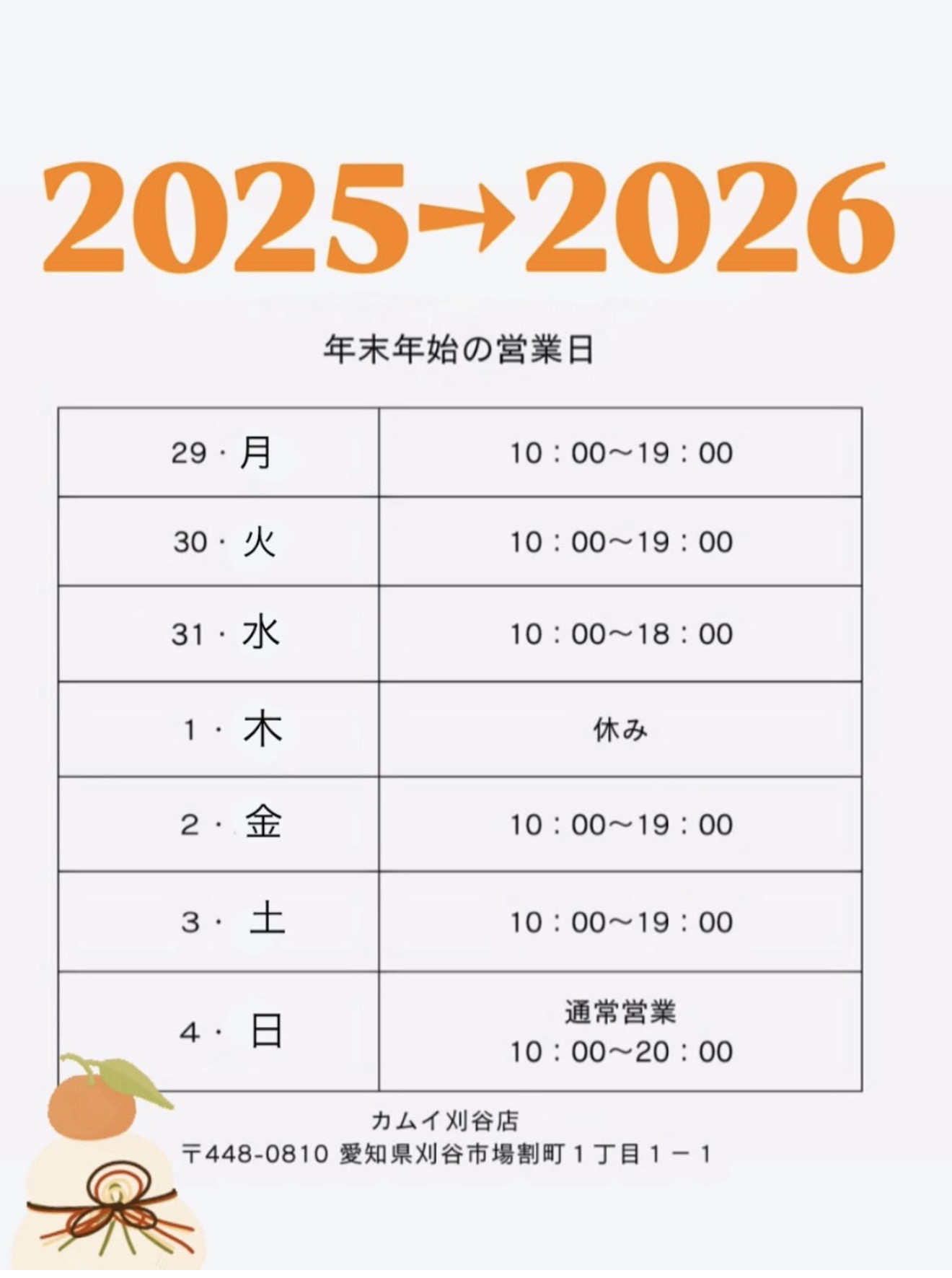 年末年始の営業時間は下記の通りとさせていただきます。